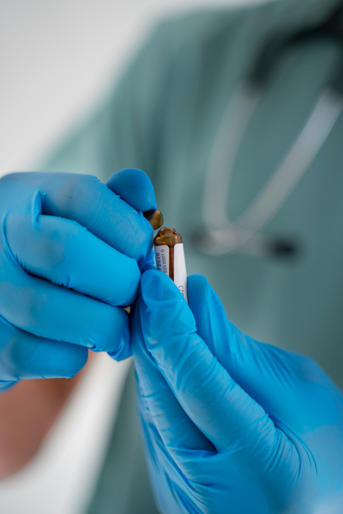 A medical professional in a white coat and blue gloves holding a vial of separated blood, preparing Platelet-Rich Plasma for a patient in a clinic.