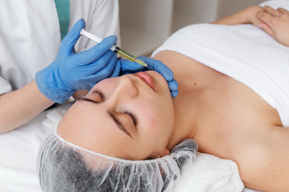 A medical professional administering a Platelet-Rich Plasma (PRP) injection into a female patient's forehead.
